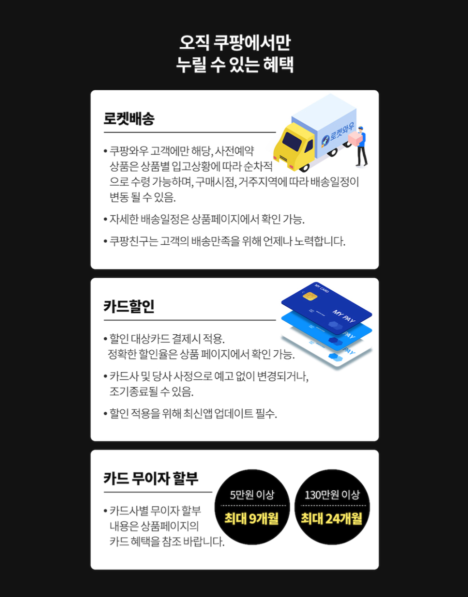 쿠팡의 경우 카드사 할인이 10% 가능하며 150만원 이상은 우리, 신한, 롯데, 삼성, 국민카드 할인이 가능합니다.