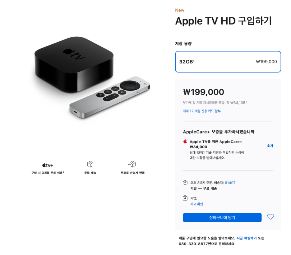 애플TV 4K는 오늘, 2021년 11월 4일부터 국내 정식 구매가 가능하며 아직까지 배송이 밀리지는 않은듯 합니다.