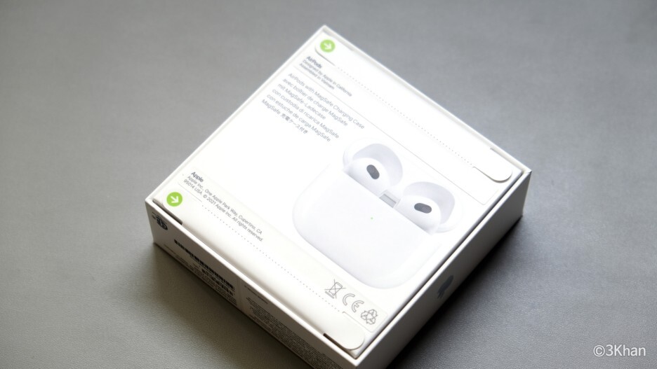 이번 에어팟3 부터는 맥세이프 무선 충전 케이스가 기본이기 때문에 맥세이프 차징 케이스 각인이 쓰여 있습니다.
