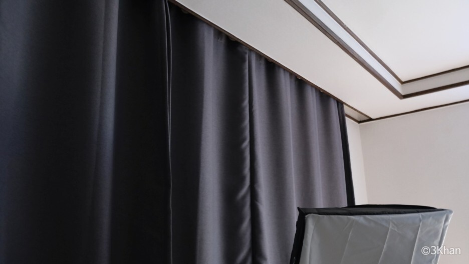 아무래도 밝은 제품이 아니다보니 이렇게 암막 커튼으로 빛을 차단하고 불을 꺼야 좀 쓸만합니다.