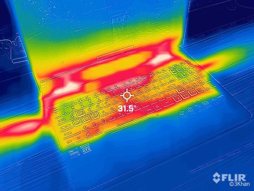 그리고 손이 주로 닿는 키보드 부분이나 중앙 부분은 30도 초반 정도로 낮은 온도를 보여줬는데요.