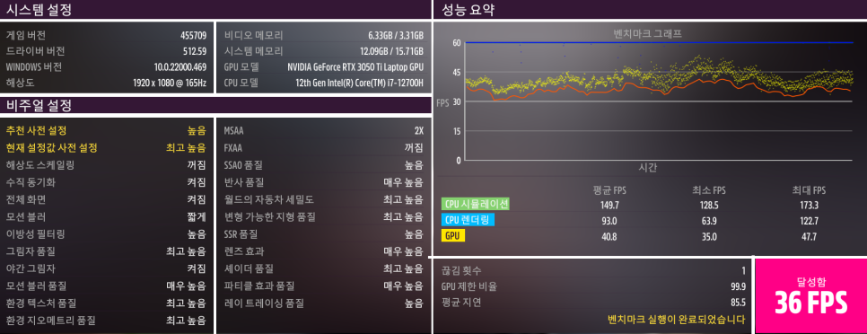 최고높음 옵션은 36프레임, 보통옵션은 93프레임이 나왔고 최신 게임이다보니 사양을 조금 타는 듯 합니다.