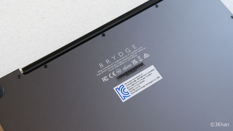 하단에는 브릿지로고와 각종 인증로고가 있고 맥북처럼 미끄럼 방지 발판이 있습니다.