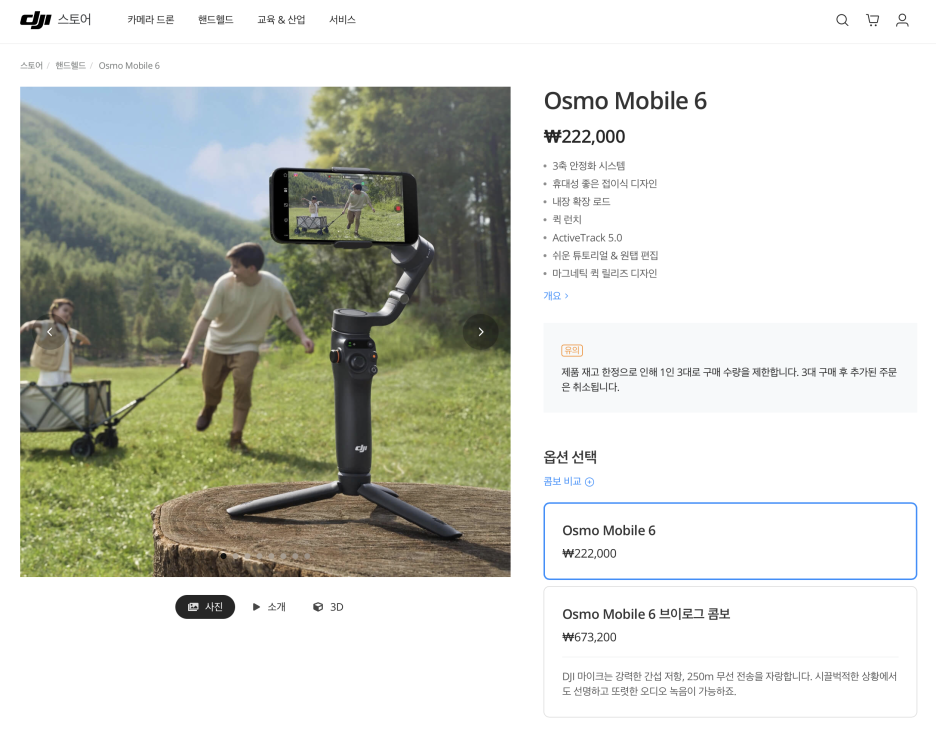 그리고 신형 DJI OM6 가격이 굉장히 많이 올랐는데, 22만 2천원으로 구형 대비 가격이 올랐습니다.