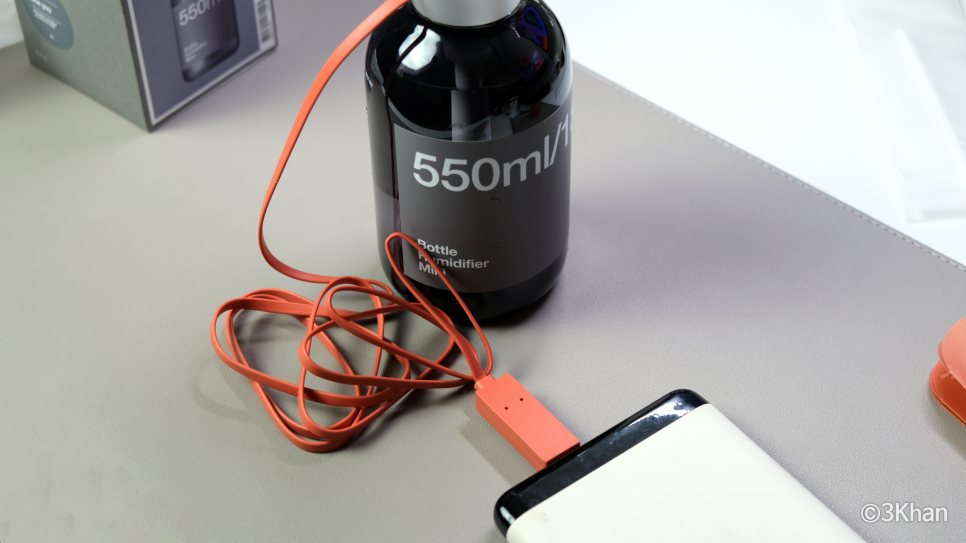 USB 유선 전원을 사용하는 미니 가습기이며 기본적으로 약 550ml의 물을 담을 수 있는 물통형 입니다.