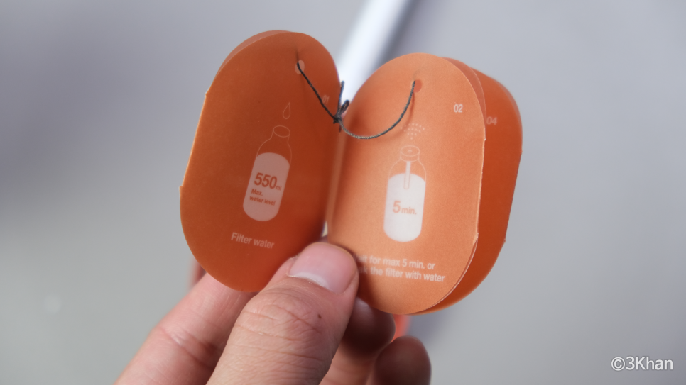 플라스틱 소재로 된 물병에 물을 550ml 가량 넣으면 되는데, 물통에 MAX선이 표기 되어 있어서 대략 맞춰주면 됩니다.