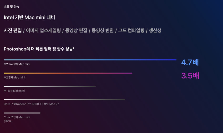 인텔 기반 맥미니 기준으로 성능 비교 그래프를 만들어놔서 조금 요상하기는 하지만 성능은 확실히 좋아졌습니다.