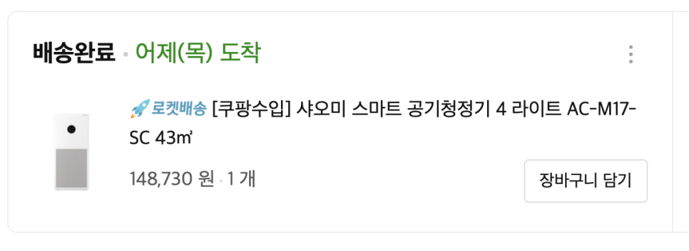 이전에 쓰던 샤오미 공기청정기도 쿠팡 로켓으로 구매했고 큰 문제는 없었네요.