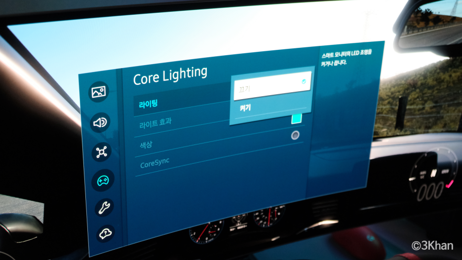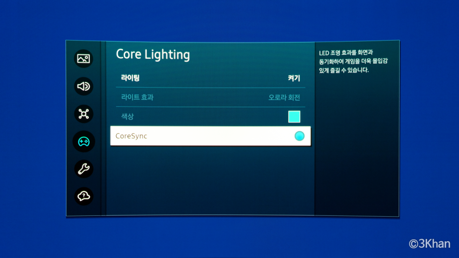 그리고 옵션 설정에 코어 싱크라는 기능이 있는데 이 기능은 화면에 출력되는 컬러에 후면 라이팅을 싱크 해주는 기능입니다.
