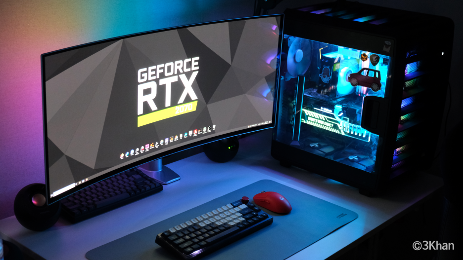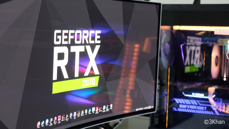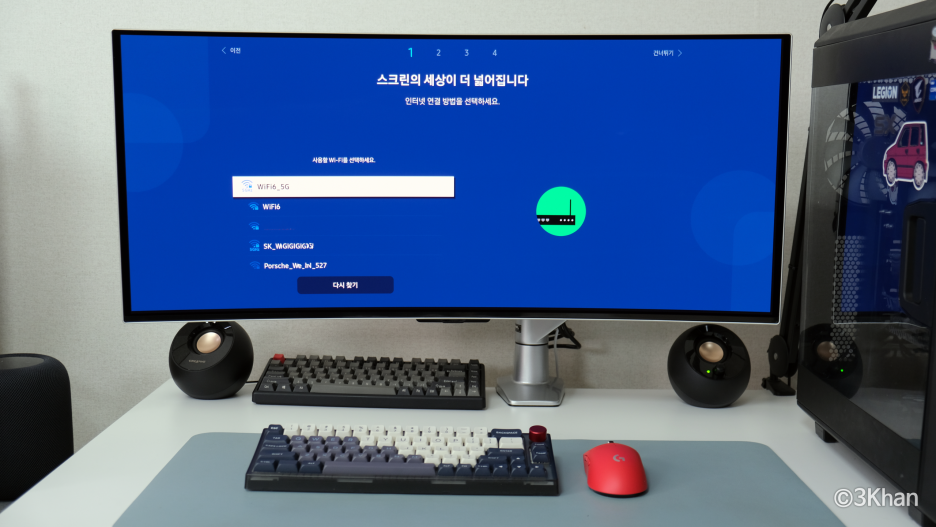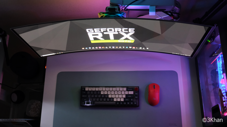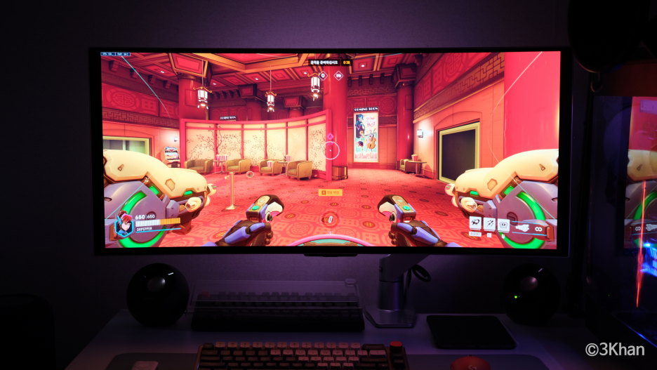 실제 게이밍 환경을 짧게 촬영해 본 모습인데 정면에서 보면 몰입도가 상당히 좋습니다.