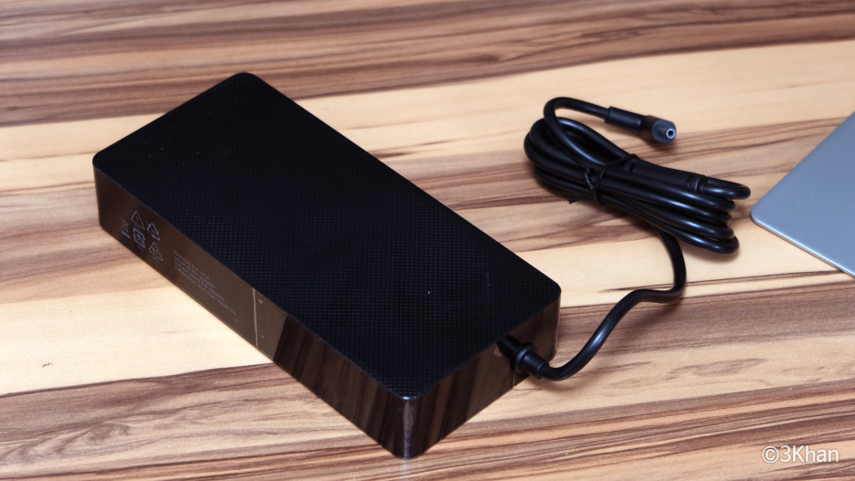 전원 어댑터의 경우 이렇게 상당히 커다란 어댑터가 제공되는데 모니터 안에 내장되어 있는 게 아니라 외부로 빠져있습니다.