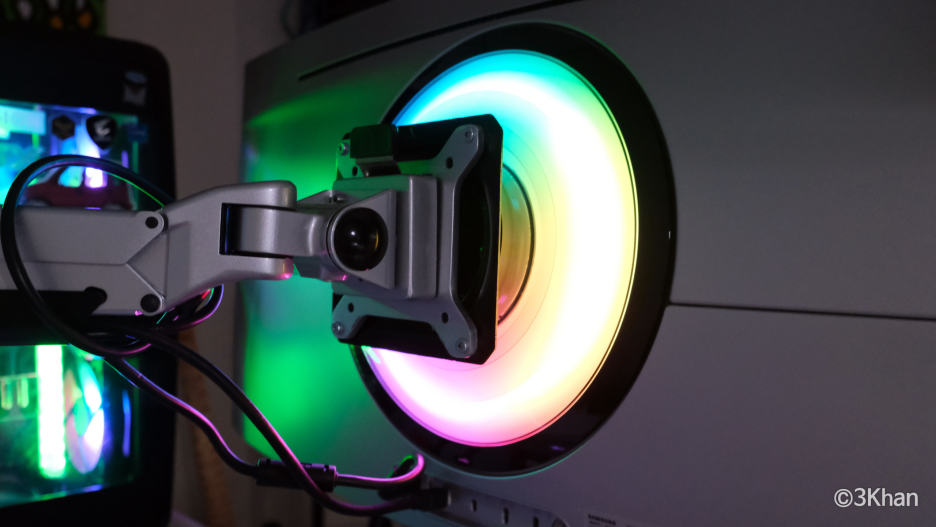 저처럼 모니터암으로 어느 정도 벽이랑 붙여서 쓴다면 벽에 은은하게 반사되는 빛이 꽤 보기 좋습니다.
