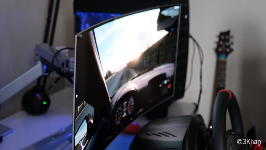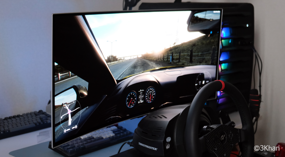 레이싱 휠에 레이싱 게임도 자주 하는 편이라 와이드 모니터로 다시 구매를 했는데 OLED 색감이 정말 쨍하고 좋습니다.