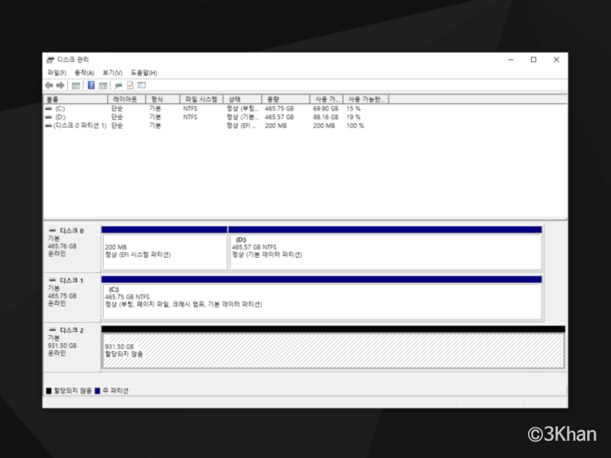 가장 아래에 새로 장착한 SSD가 표시되고 할당되지 않음이라고 뜨는데요.