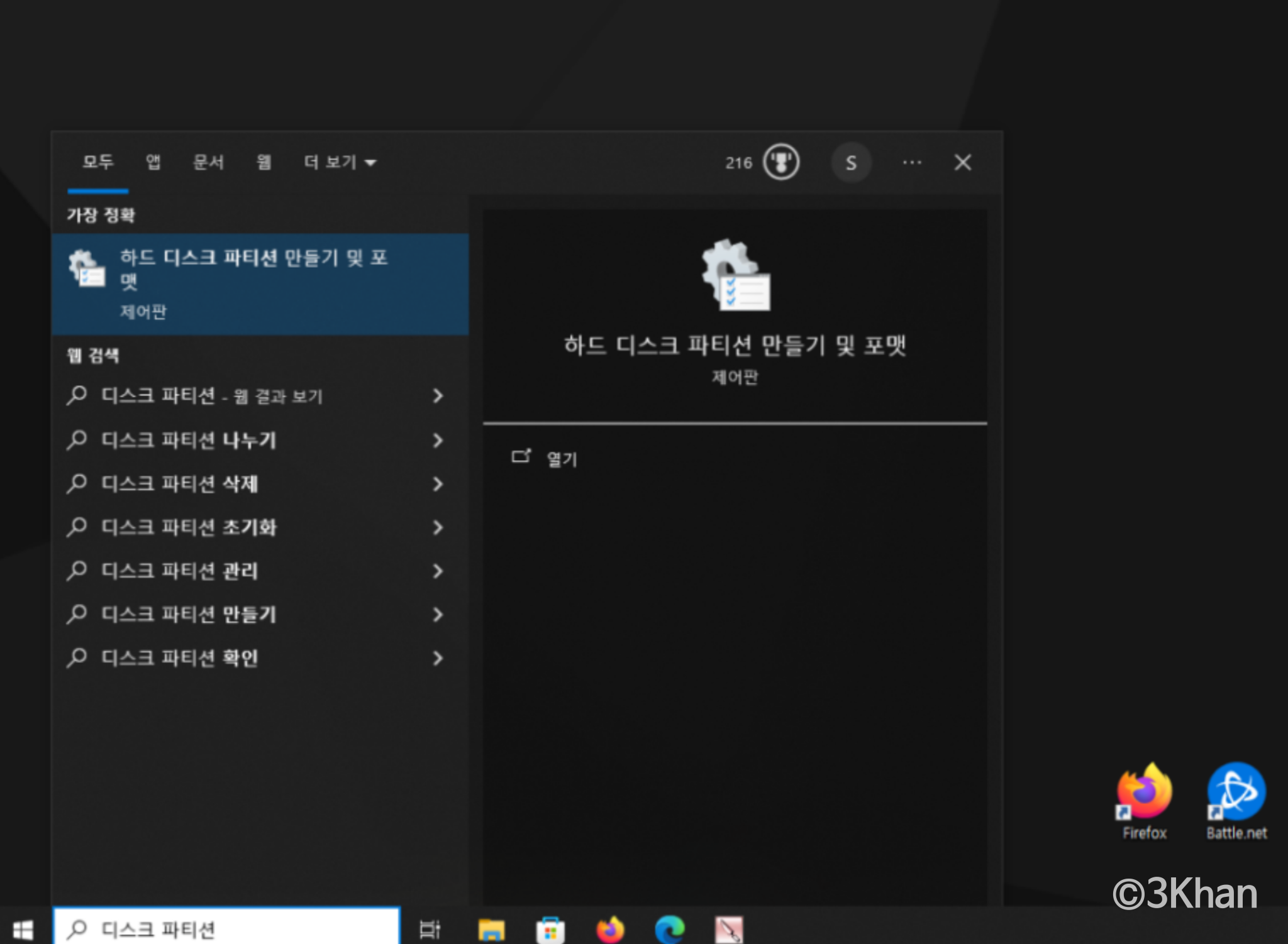 그럴 때는 윈도우 검색창에서 디스크 파티션을 검색해서 해당 메뉴로 들어가줍니다.