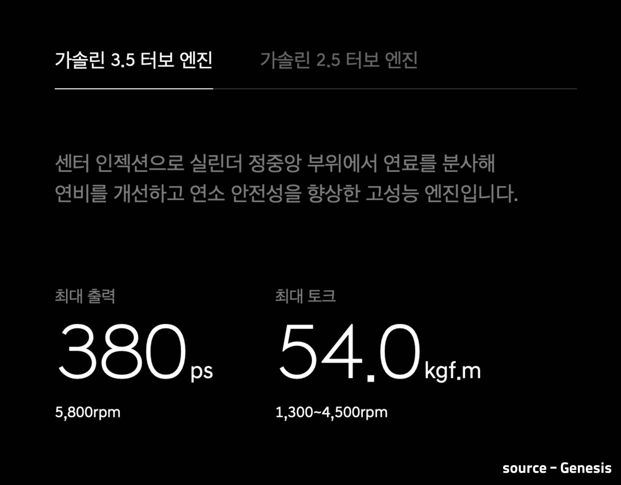 2.5 터보, 3.5 터보도 동일하게 선택 가능하지만 쿠페 모델인 만큼 고성능 파워 트레인이 잘 어울리죠.