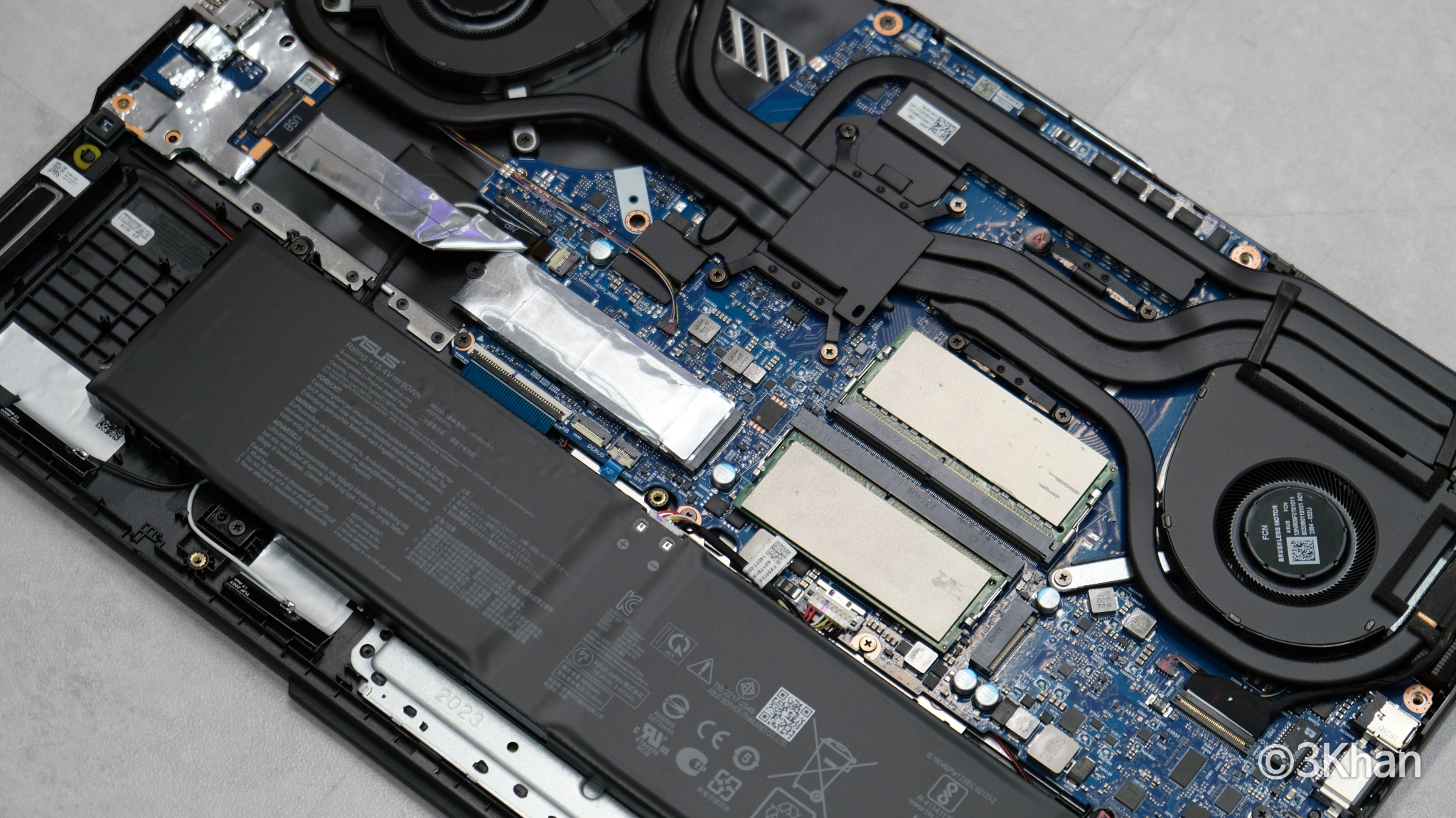 중앙 부분에 램이나 SSD 슬롯이 있고 그 아래로는 90Wh의 대용량 배터리가 있습니다.