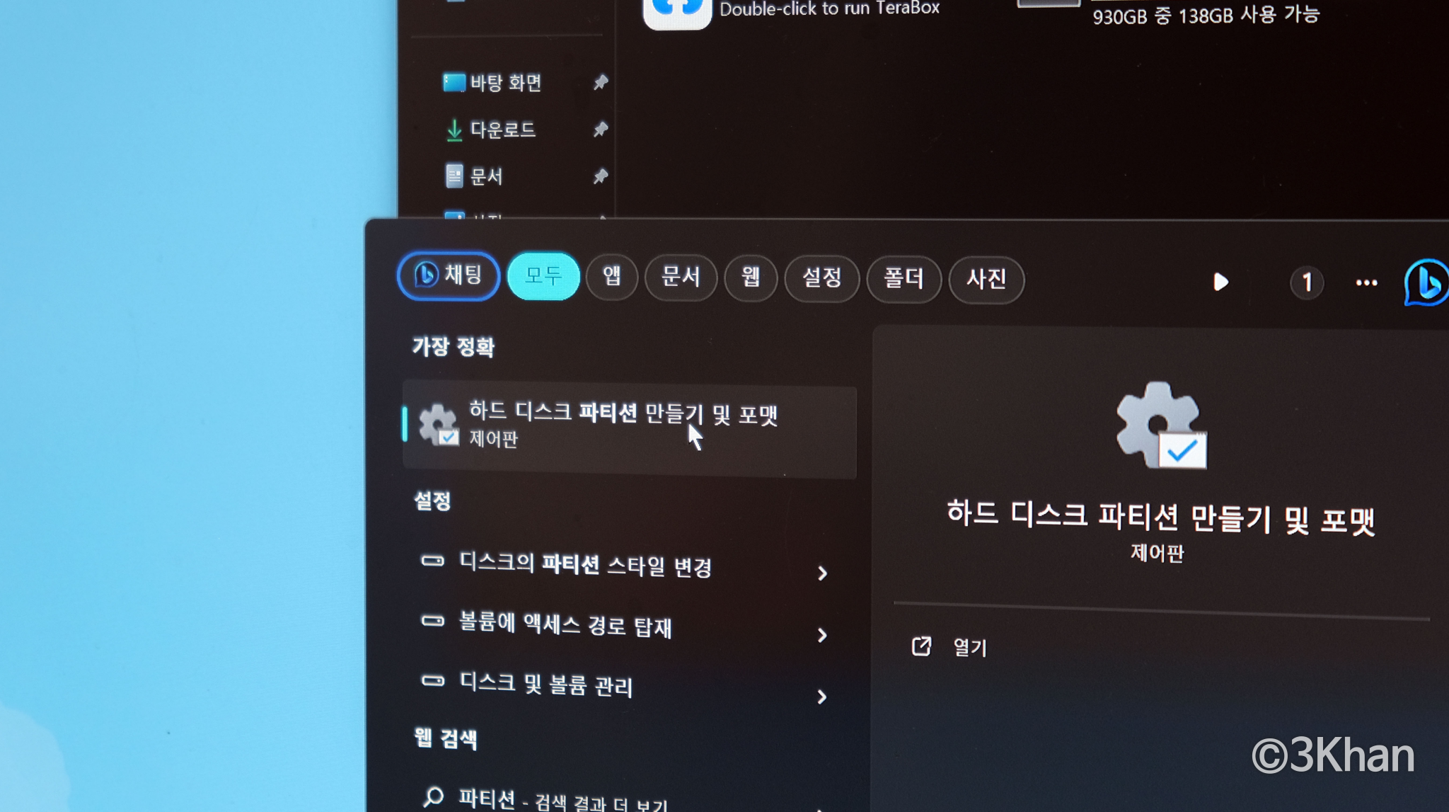 윈도우 검색창에 파티션으로 검색하면 하드 디스크 파티션 만들기 및 포맷 메뉴가 뜹니다.
