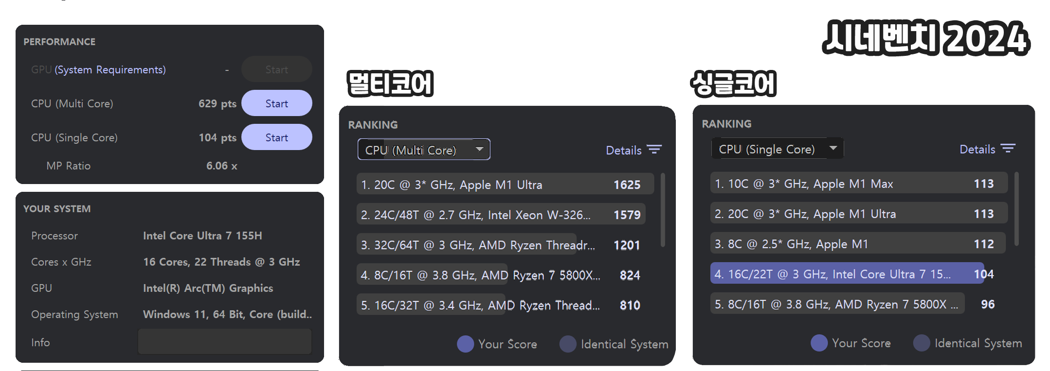 인텔 코어 울트라 7 155H의 시네벤치 2024 결과는 멀티 코어 629점, 싱글코어 104점 정도로 측정이 되었는데요.