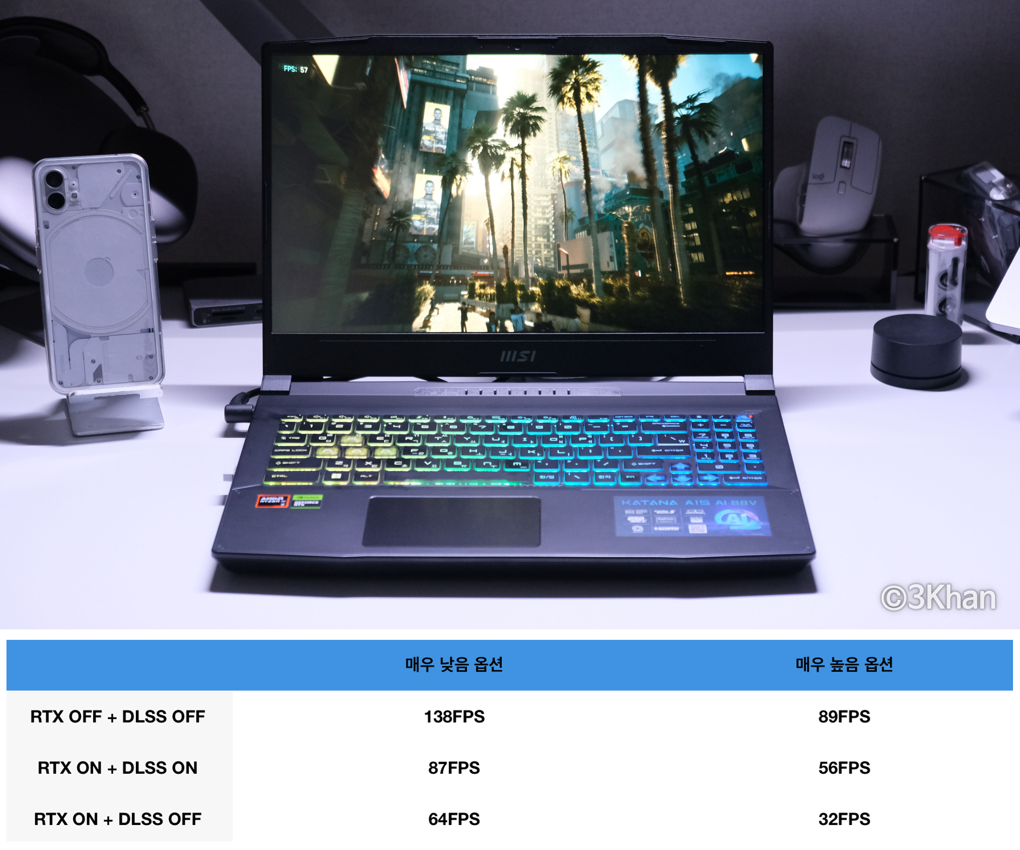 인 게임 플레이에서도 꽤 좋은 성능을 보여줬고 RT+DLSS3 중간 옵션 기준 평균 55FPS 하위 1% 45FPS로 아주 좋았습니다.