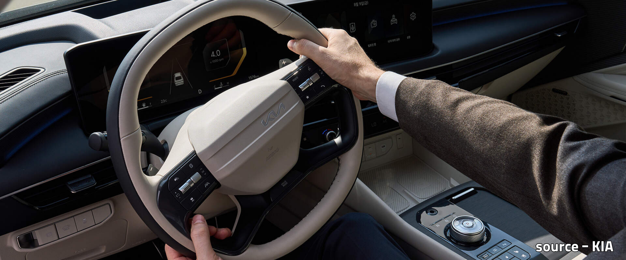 실내 디자인에도 변화가 있었는데 EV3, EV9과 비슷한 12.3인치 듀얼 디스플레이와 새로운 스티어링 휠 디자인이 적용되었습니다.