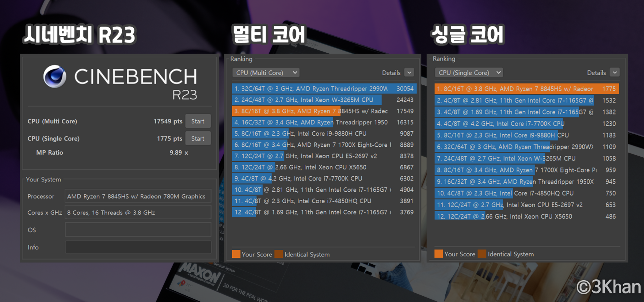 CPU 벤치마크는 이전에도 많이 하긴 했지만 다른 8845HS 탑재 제품과 거의 비슷한 수치입니다.