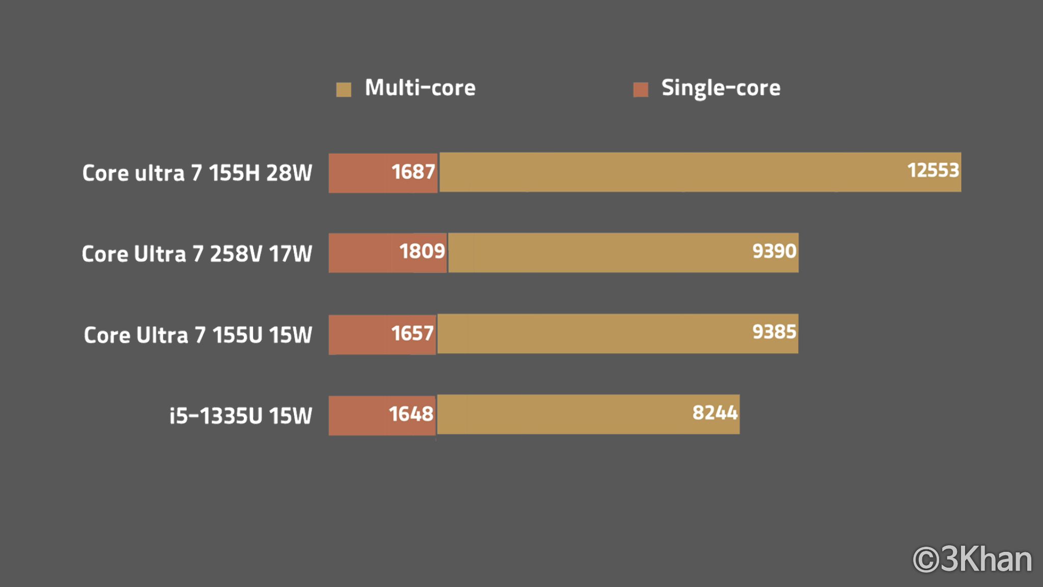 구형 프로세서인 155H는 28W 기반으로 당연히 점수가 더 높을 수는 있는데 일단 싱글코어 성능이 향상된 것이 눈에 띕니다.