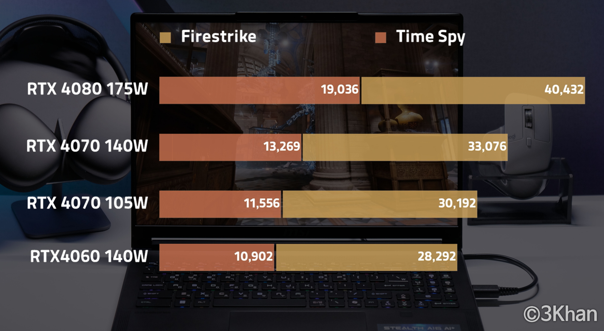 105W의 RTX4070 성능도 테스트해봤는데 3D 마크 벤치 결과는 위 표와 같습니다.