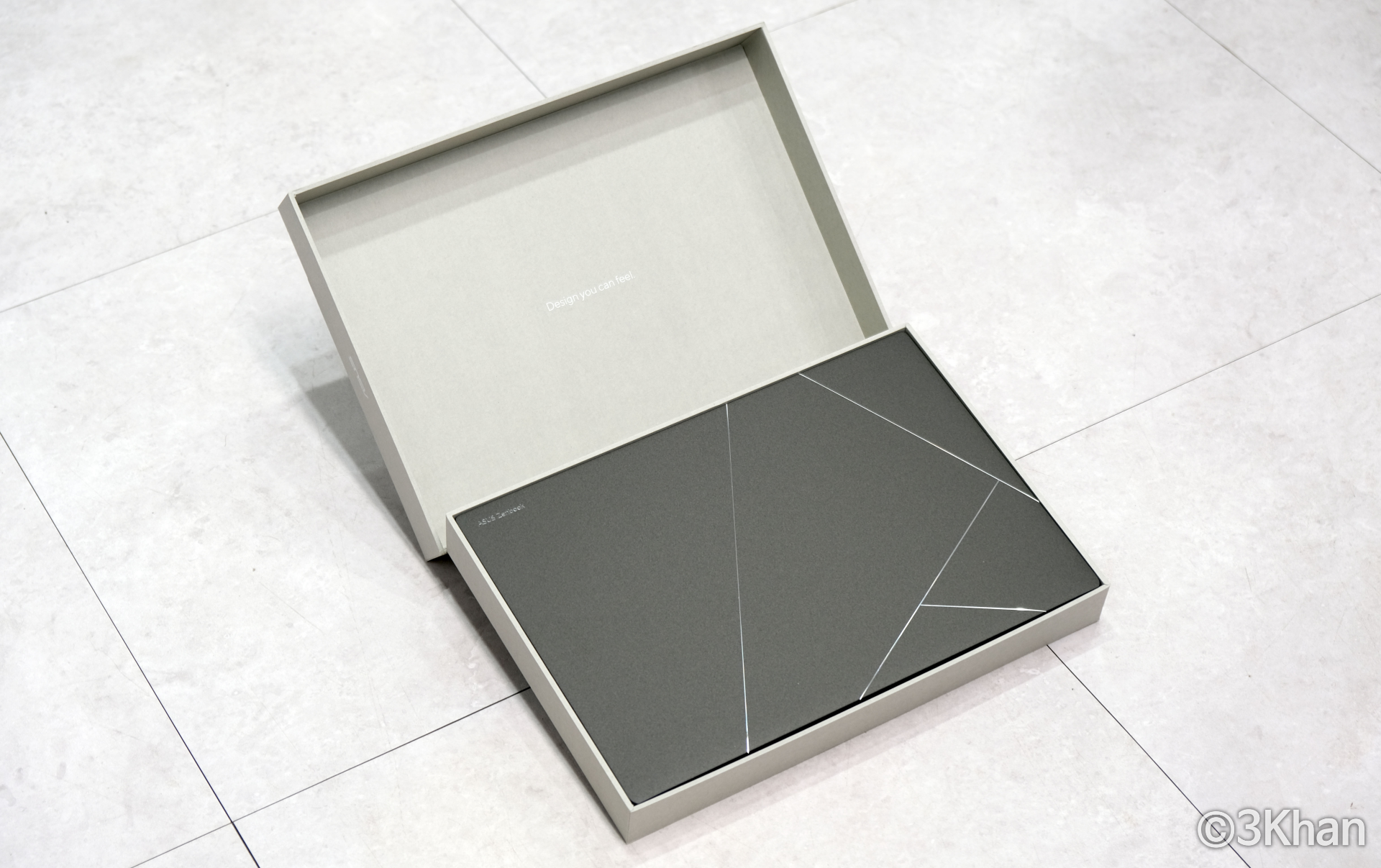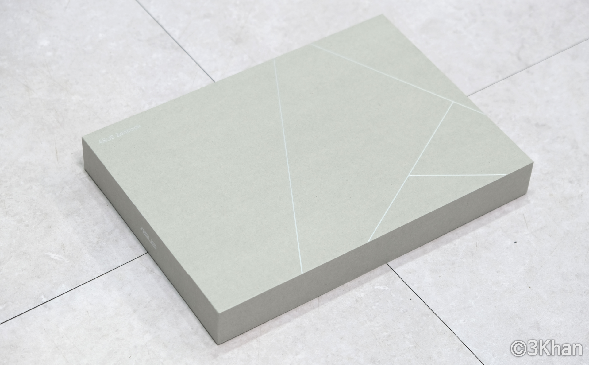 에이수스 젠북 전용 로고 패턴이 들어간 박스와 노트북 본체.