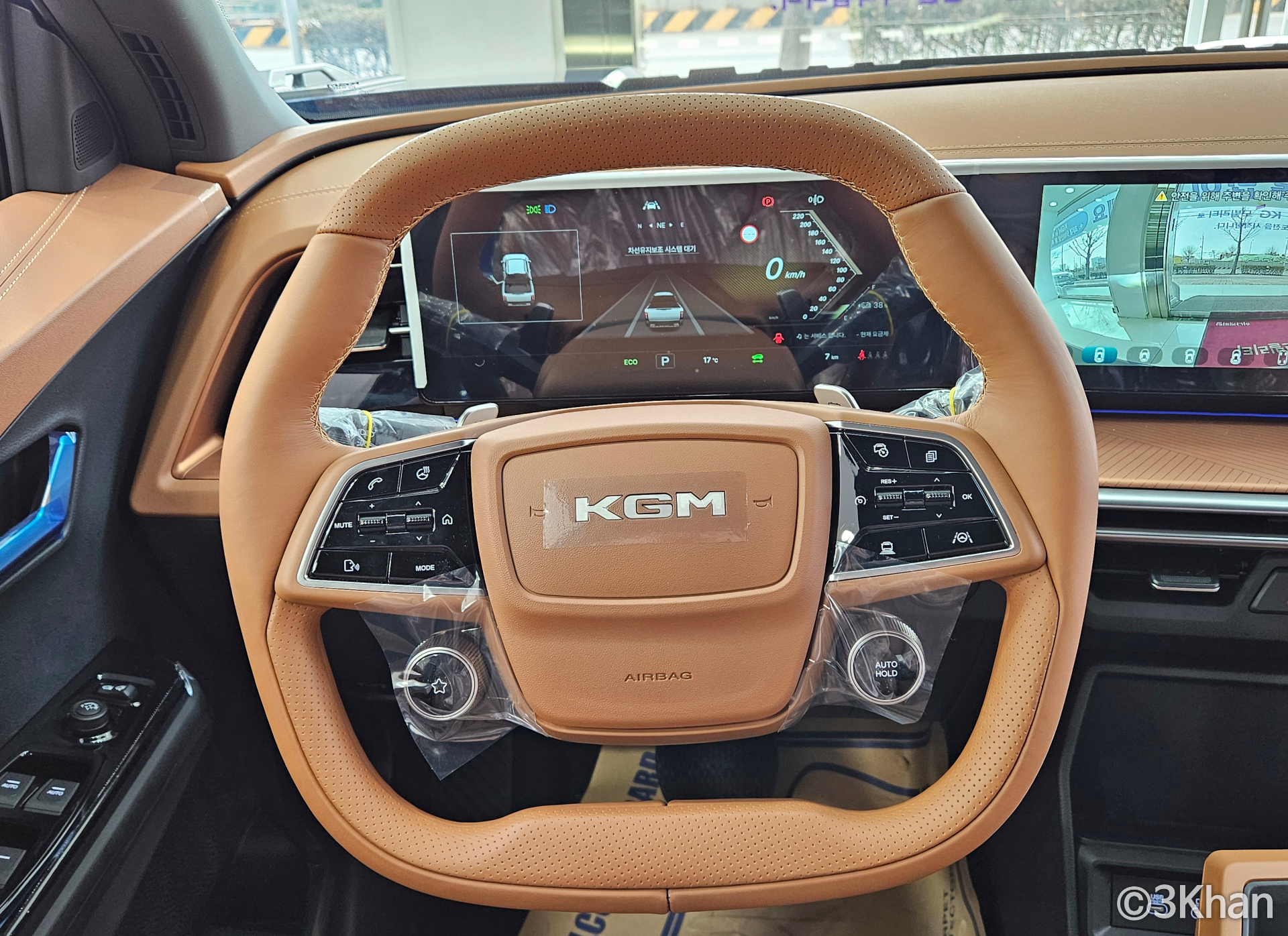 스티어링 휠 디자인이 살짝 생소하긴 하지만 확실히 최신 차량 느낌이 많이 나는 무쏘 EV 실내 실물입니다.